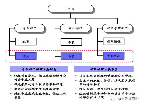 对于专业部门经理而言,应该树立以项目管理为中心的思想,积极配合项目管理的各项工作。专业部门也身负项目管理相关的开发、支持、监督、执行这四项职能。开发方面,专业部门应该开展大量业务建设工作,对各项目的经验及时进行总结,将项目生产中运用到的各项技术资源进行模块化、标准化开发,以不断提升生产效率。支持方面,专业部门应该支持项目经理的管理工作,为项目提供合适的人力资源和技术资源支持。监督方面,专业部门也应主动监督本部门各专业人员在各项目中的表现,配合项目经理及时解决各类突发问题,并对专业人员的长期职业发展提供辅导和建议。执行方面,专业部门责无旁贷得需要对本专业参与的各项目的进度完成、技术和质量水平负责,和项目经理一起共同承担项目的成败。